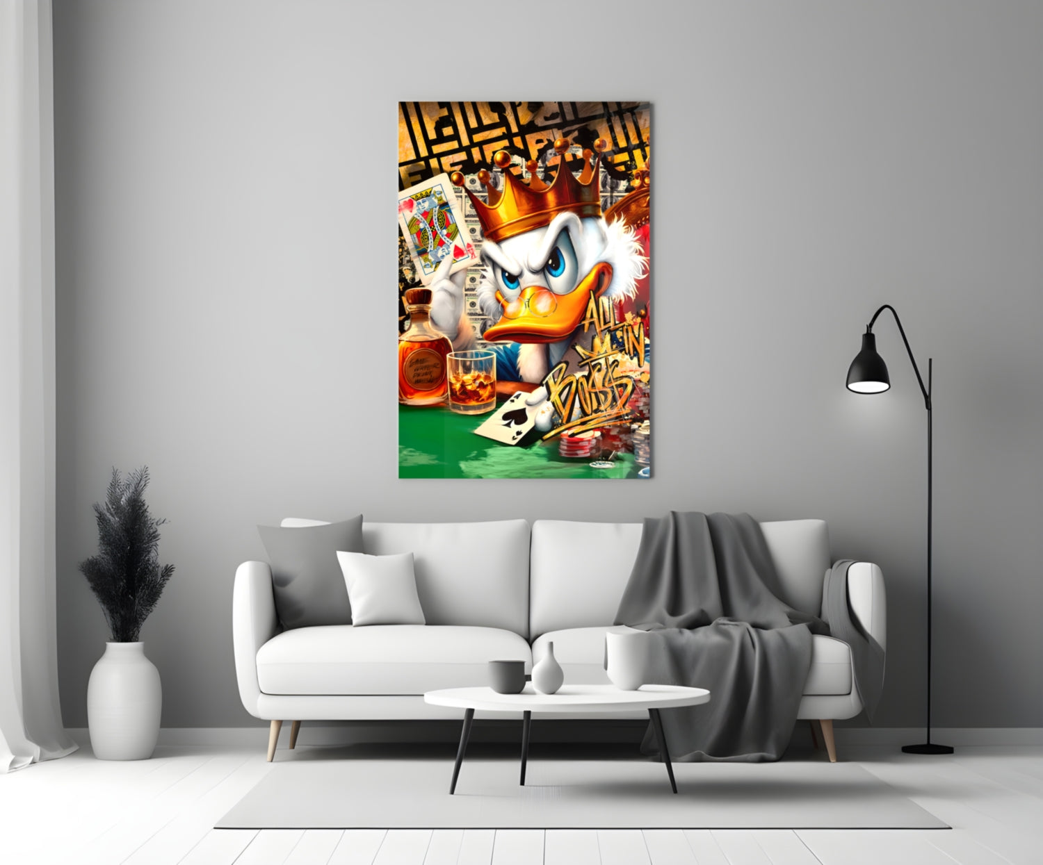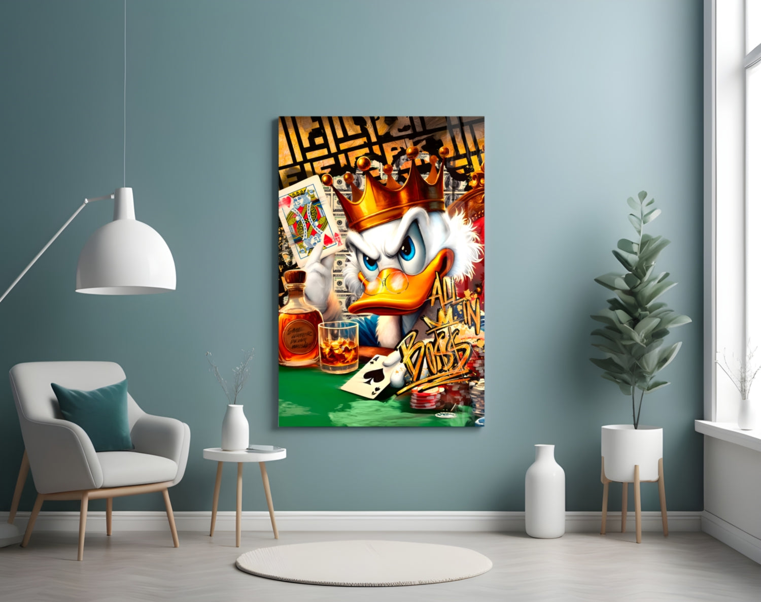 Scrooge King of Poker Glass Wall Art brings bold design to your space with premium tempered glass and UV-resistant printing. Available in four sizes—from 28.5″ × 18″ to 55″ × 35″—this piece suits any room. Crystal-clear imagery, glossy edges for depth, and included steel mounting hardware make installation seamless. Wipe clean with a damp cloth to maintain its vivid brilliance for years.